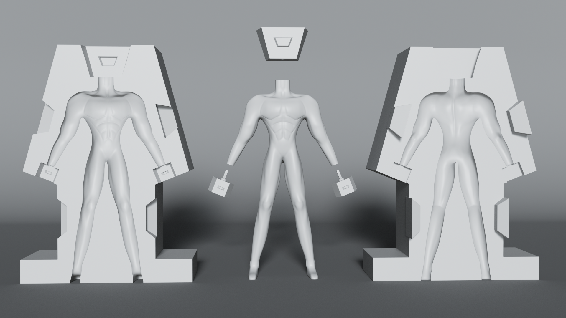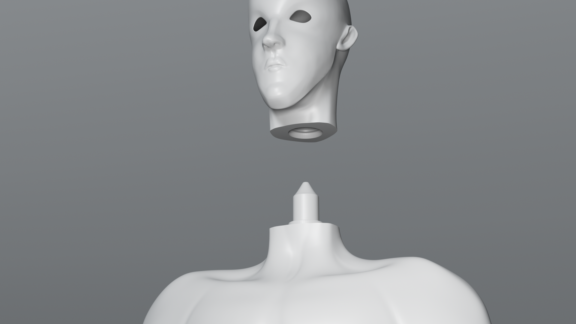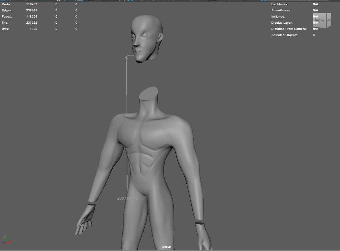 The character was divided into separate components to support fabrication and assembly. Key parts such as the head, hands, and body were split from the body using booleans.